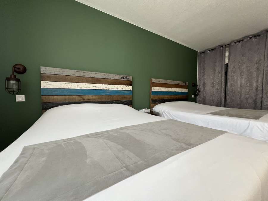 - Composée d’un lit en 160x190 ou 180x190 et de 1 lit superposé (2 matelas 90x190) en chambre cabine